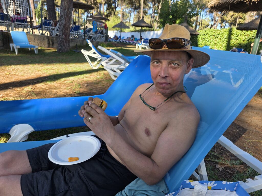 Så himla gott. Å man kan gå beställa vad som helst mellan måltiderna. Här glutenfri baguette till mig och hamburgare till Kent